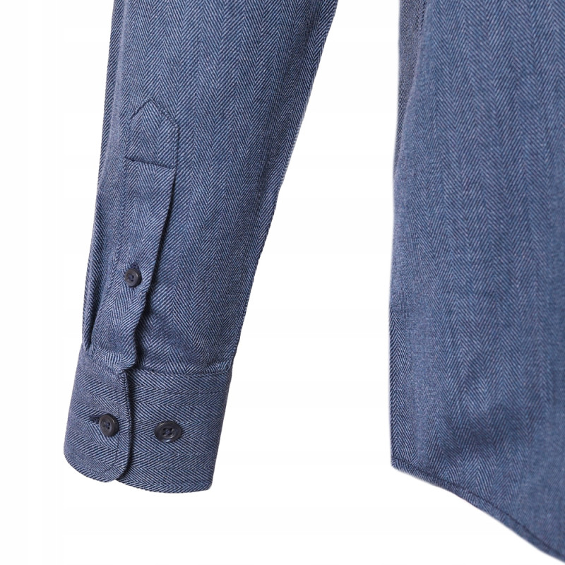 Stylowa męska koszula z długim rękawem, uszyta z wysokiej jakości bawełny o subtelnym wzorze w jodełkę. Materiał jest naprawdę miękki w dotyku, co sprawia, że noszenie koszuli to czysta przyjemność – zapewnia komfort przez cały dzień.