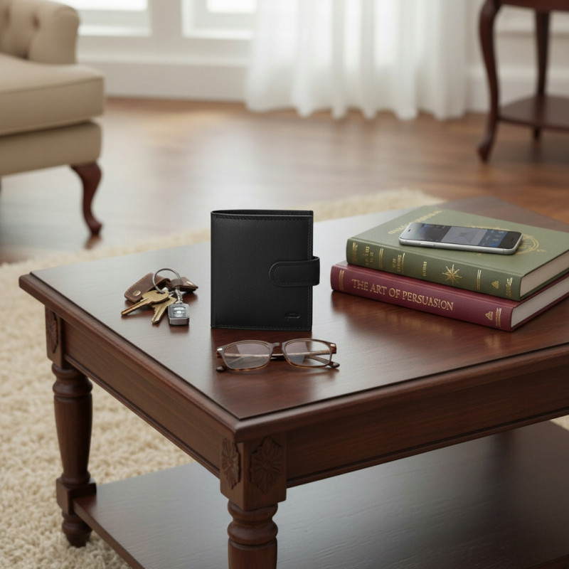 Stylowy portfel wykonany z wysokiej jakości naturalnej skóry w eleganckim, czarnym kolorze. Łączy w sobie klasyczny design z praktycznym układem wnętrza.
