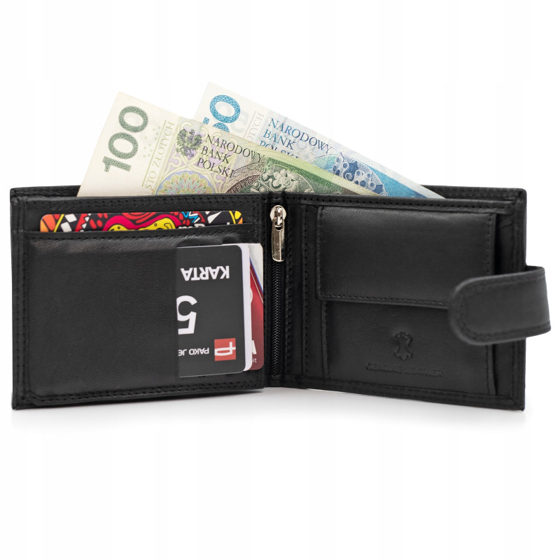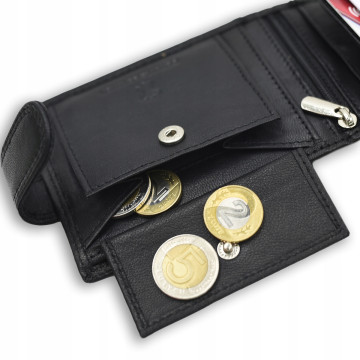 - 1 kieszeń na drobniaki, zamykana na klapkę z zatrzaskiem, dzięki czemu drobne pieniądze nie wypadają nawet podczas intensywnego użytkowania