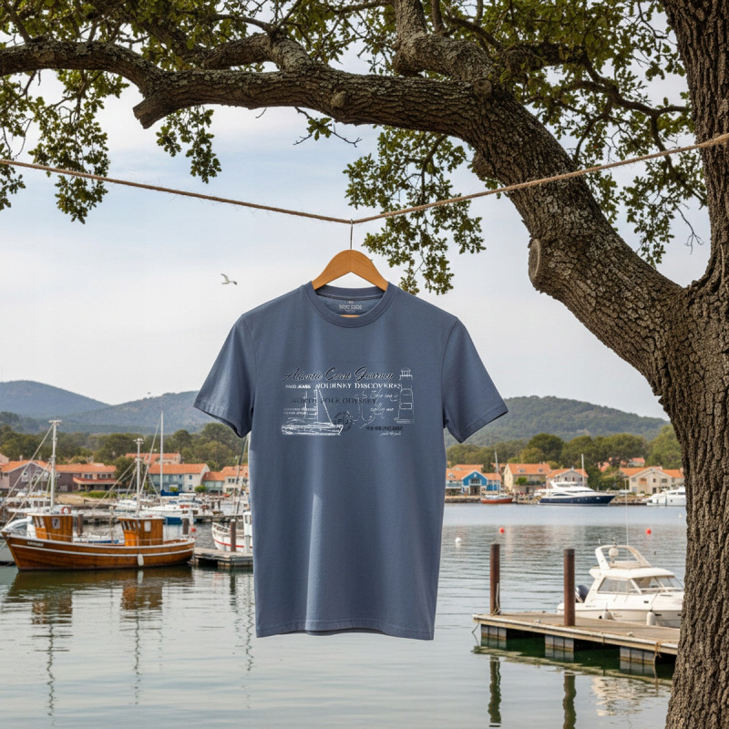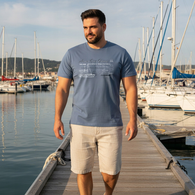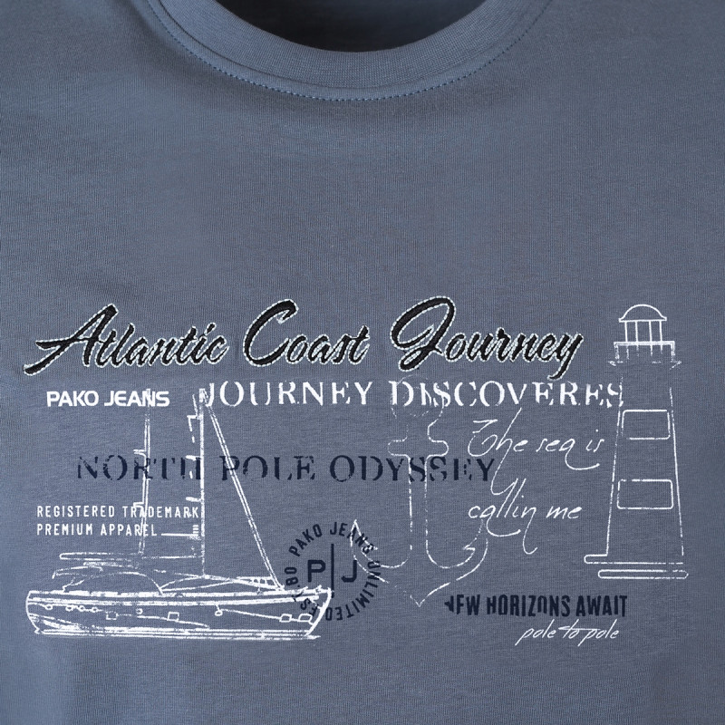 Męska koszulka z krótkim rękawem w stonowanym, stalowym kolorze. Na przodzie znajduje się subtelny nadruk inspirowany motywem podróży i morskiego klimatu, który nadaje koszulce spokojny, casualowy charakter.